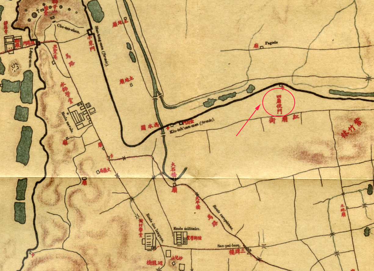 在法国人P.L.盖拉蒂清光绪二十四年(1898)绘制的《江宁府城图》上,金川门与神策门之间多了一座城门,名曰“四扇便门”。查阅《同治上江两县志·城厢考》记载城内基层行政划分“右西北第二十六甲”条目如下:“百子亭、神策门口、府后岗、双沟、门楼、北菜市口、狮子桥、十八家、万家巷、紫竹林、四扇北门。”这里的11处地名,都在老城区内的北部区域。P.L.盖拉蒂绘制的《江宁府城图》上的“四扇便门”应该就是“四扇北门”即“小北门”。