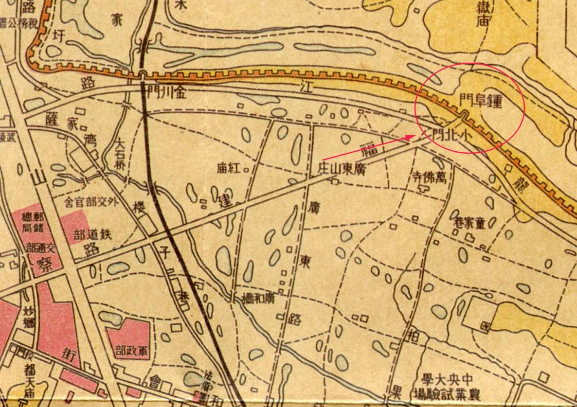 然而到清光绪三十二年(1906)南洋陆地测量司绘制的《南京北部图》,竟错误地将P.L.盖拉蒂地图中的“四扇便门”标注为“钟阜门”。接下来的清宣统元年(1909)《陆师学堂新测金陵省城全图》、1929年《首都城市图》、1937年《最近实测新南京市详图》、1943年《南京市市街图》、1948年《南京市街道详图》,原“四扇便门”即“小北门”,依然错误地标注为“钟阜门”。不知是否绘制地图的工作人员已经怀疑这座城门不是“钟阜门”,1929年、1937年、1948年的地图上,“钟阜门”的旁边加有“小北门”字样。