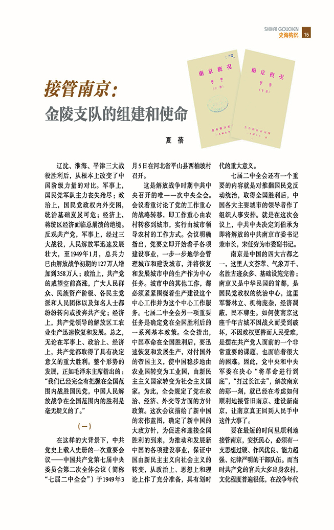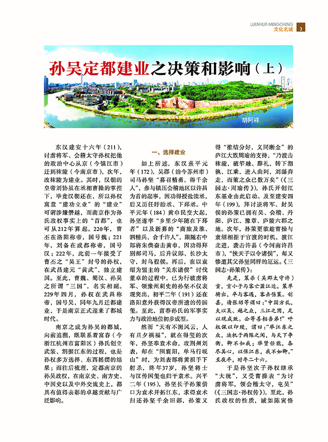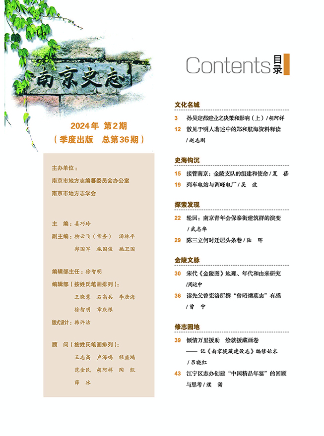 本期《文化名城》栏目,重磅刊载了南京大学教授胡阿祥老师的《孙吴定都建业之决策和影响(上)》一文,系统深刻地分析了孙吴定都南京的历史背景和历史必然,记述了孙吴都城建业的营建情况。《史海钩沉》栏目继续以南京解放75周年为主题,刊载了南京市档案馆研究员夏蓓的系列文章之《接管南京:金陵支队的组建和使命》。