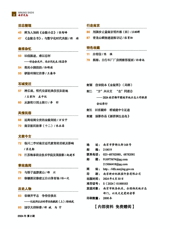 《南京史志》2024年第二期近期出版。全刊88个页码,约13万字,90余张图片,设有《文化名城》《史海钩沉》《探索发现》《金陵文脉》《修志园地》《旧志整理》《秦淮杂忆》《石城变迁》《风情民俗》《文教今古》《掌故逸闻》《历史人物》等栏目。