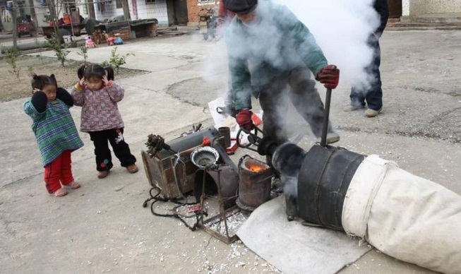 一刻工夫,老头站起来,将一个长长的布袋子套进炒米机。围看的娃乖巧得很,晓得马即要开锅了,一个个离得八丈远,胆小的还用两只小手紧紧地捂住耳朵。