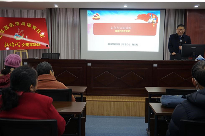 近日,秦淮区志办赴光华路街道海福巷社区和夫子庙街道乌衣巷社区开展方志文化进社区活动,区志办副主任赵志村以《如何在寺庙旅游》为题,将历史文化与寺庙旅游相结合,助力秦淮全域旅游。两个社区百余名群众聆听讲座。