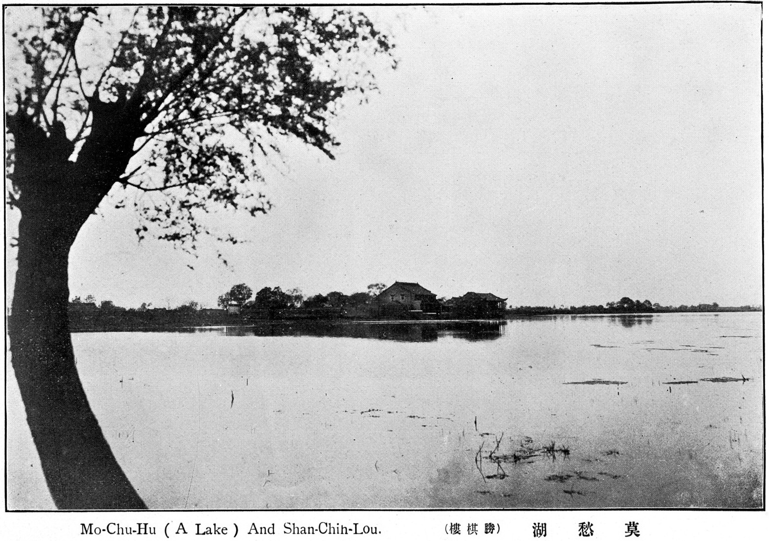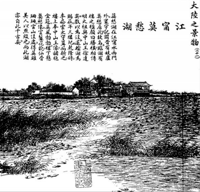 上图为日报“大陆之景物”栏目所刊的《江宁莫愁湖》,仔细辨认所绘景象,应是从莫愁湖东北方向朝西南眺望:湖畔曾经圮废的胜棋楼为乾隆年间江宁太守李崧云重修。