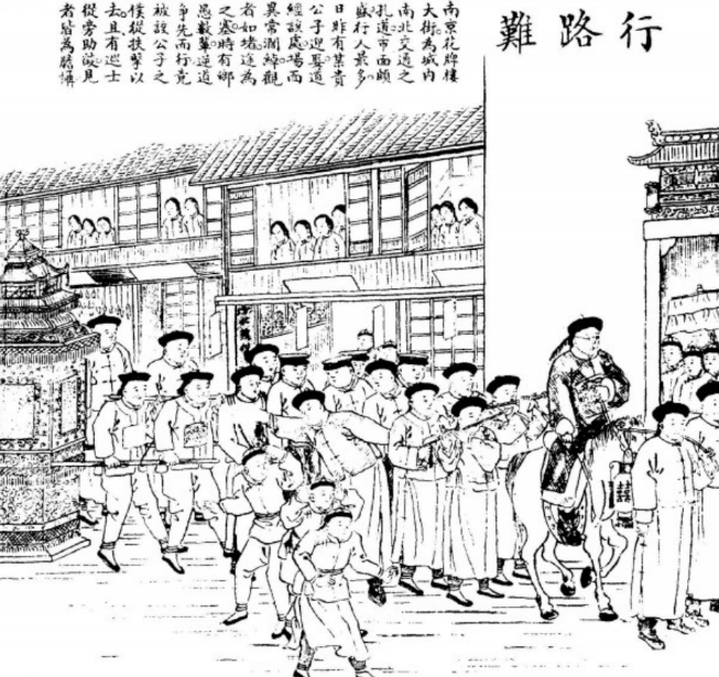 日报的“时事新闻画”栏目内容涉及面较广,上面这幅《行路难》就是其中一则图画新闻。当时花牌楼大街(今杨公井一带)系金陵城内南北交通要道之一,“市面颇盛。行人最多”。画中一位贵公子迎娶娇妻途经这里,由于“场面异常阔绰,观者如堵”,影响到路人通行。几位乡人“逆道争先而行”,竟遭这家仆从“抶击以去”,引得旁人胆战心惊。