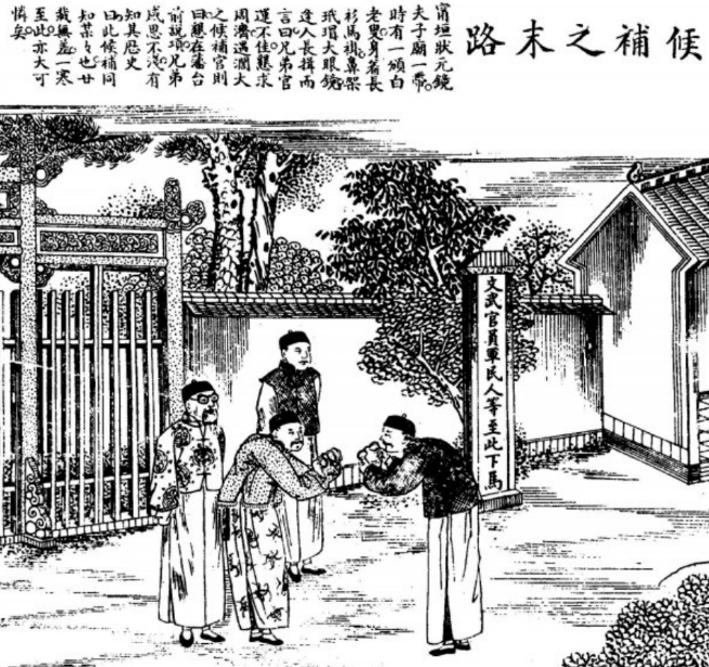 这幅《候补之末路》则记述了一位经常在状元境、夫子庙一带,身穿长衫马褂、戴副玳瑁大眼镜的斑白老叟,他逢人便拱手高举、鞠躬乞讨:“兄弟官运不佳,恳求周济。”若遇权势人物,该叟不忘恳请在江宁布政使面前为其多多美言,表示定当“感恩不浅”。据知情者披露,此人确实为候补同知。然候补20年仍未被委派差事,感叹“一寒至此,亦大可怜矣”!