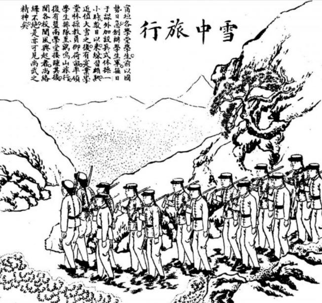 清朝末期国内外形势复杂多变,社会动荡不安。当时南京各学堂“以国势日急”为由,相继成立学生军,每天课外另增1小时军体训练。《雪中旅行》描绘了1909年冬的一场大雪后,实业学堂教师柳荷宙带领学生集体登鸡鸣山锻炼,暨南学堂师生随后而至,其他学校亦闻风兴起的场景,从画中能感受“尚武之精神”。