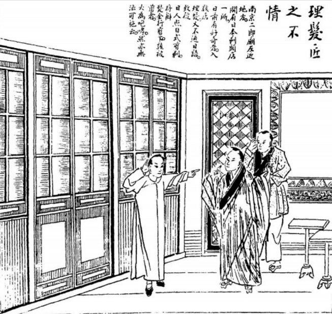 这幅《理发匠之不情》讲述金陵城中大行宫西南的二郎庙附近,有一家日本人开设的理发店,好奇者慕名前来理发,由于彼此语言不通,理发师按日式剪剃,将其辫发全给剪掉了。要知道清代男子不留辫发是要被问罪的!故此客“大为咆哮”,不过事后再懊恨也没法补救了。