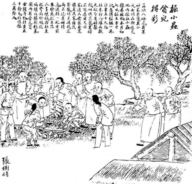 《掘小虫贫儿得彩》记述了一穷苦人家小孩挖地捉虫得意外之财的事。说是八条巷一穷人家小孩常在附近荒地上捉小虫子喂食家养的仔鸭。有天在荒地掘土时“忽得锡锅一具”,重达59斤,孩子告诉了母亲。消息吸引了不少往来行人,围观者欲令小孩母亲将其凿开,“以供众览”。该妇不允,执意将之抬回家。观者则跟随而至,强行用斧头凿之,“终不得开”。众人仍不散,该妇女情急之中招来一巡警。巡警命人“扛至巡警局验明”,再让炉匠熔开锡盖,发现里面藏匿50余斤金元宝、金锭。只是不知是谁家祖上的藏宝?