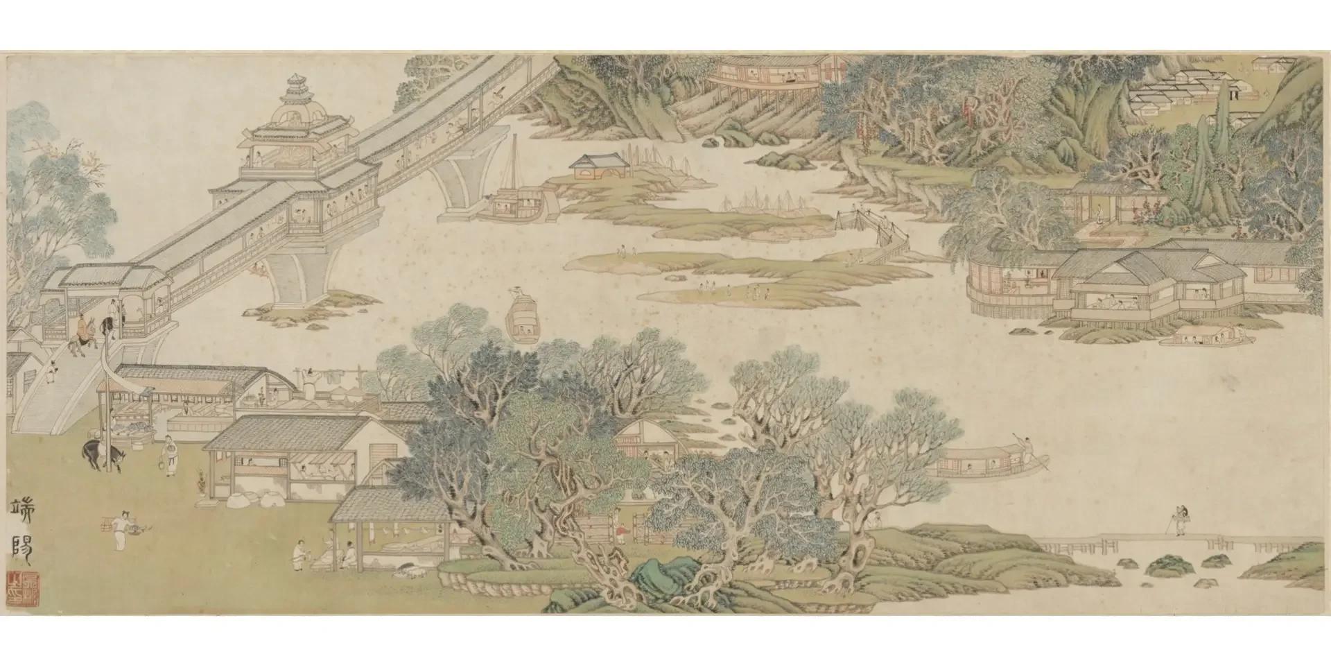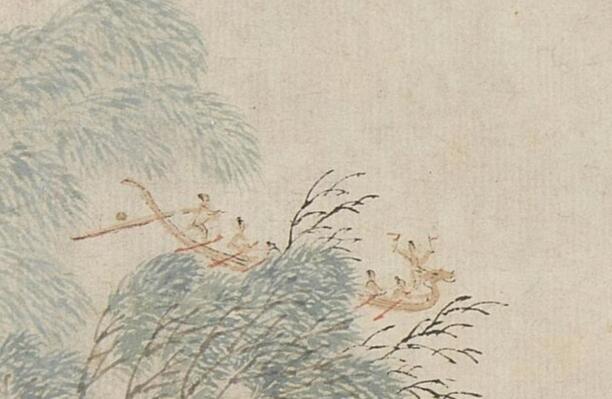 明代画家吴彬描绘一年十二个月份节庆活动的图册《岁华纪胜图》中有一幅《端阳》,以全景式构图再现秦淮龙舟竞渡。