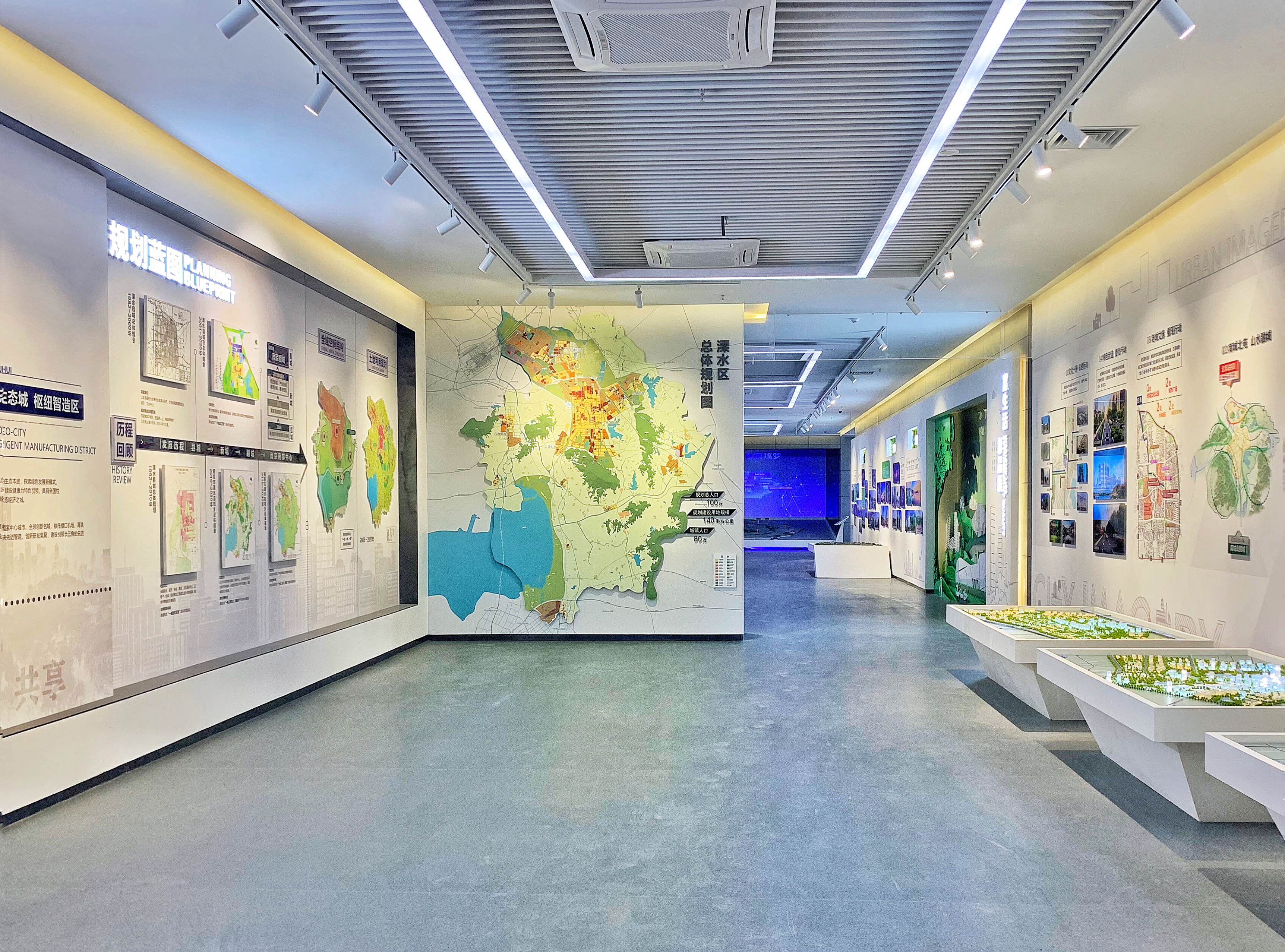 溧水区城市展示中心位于天生桥大道南侧,秦淮大道东侧,区市民之家建筑的东北角。整体展馆风格定位为城市的展示窗口,现代化科技型展示体验中心。展示中心建筑面积约6600㎡,展览面积约4500㎡,其中一层、二层、四层为主要展示区域,涵盖历史文化、城市规划、建设成就、健康溧水、休闲旅游等各专项展示内容,三层为会议室和临展区。区城市展示中心以“城”为名,厚植溧水历史人文、优势禀赋、特色成果等发展背景,与城市发展融会贯通——成就一座高品质的城市展馆。以“人”为本,为群众量身定制内容和展项,强化体验、增添趣味,让城市发展成果飞入寻常百姓家,打造一座有意思的市民展馆。以“绿”为意,以“都市绿城”为统领,通过清新舒朗的空间布局、生机盎然的绿色核心区以及环保生态的布展材料,打造出一座充满生命力的城市会客厅。