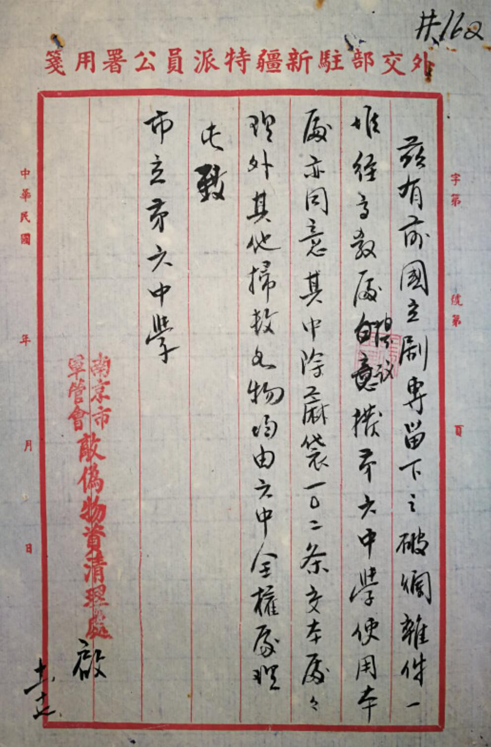 笔者有幸收藏有一份“南京市军管会敌伪物资清理处”给南京六中的公函,是“国立戏剧专科学校”文物移交给原“南京市第六中学”的佐证,在一定程度上可以帮助我们厘清该校在搬迁北京后,所存南京文物的去向。