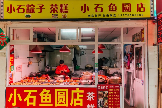 今天,如果你在清晨走入集庆门大街,便能感受到南湖菜市场的烟火气。转角处的“小石鱼圆店”已扎根二十余年,鱼丸弹滑,节前粽子日销数百只;搬迁至福园街的“安庆小陈馄饨”,仍有许多老客光顾,只为那一勺辣油的旧时滋味。向西百米,集庆副食市场内,徐州小山羊、宁夏滩羊悬挂在铁钩上,肉铺老板麻利地剁骨称重,冷链商户的冰柜里堆满带鱼、鸭舌,俨然一座肉食者的江湖。向西而行,烟火未散,现代繁华已扑面而来。从地铁2号线集庆门大街站出来,便直通河西万达广场。