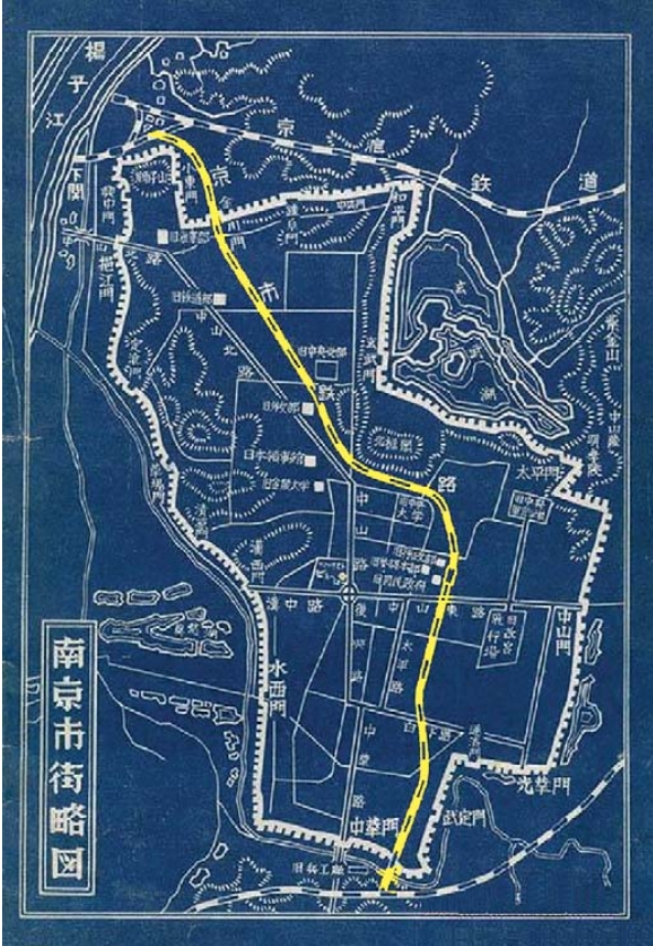 20世纪30年代的南京市街略图(黄色部分为京市铁路)