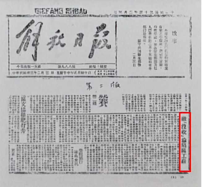 1944年2月3日,延安中共中央机关报《解放日报》第2版刊登文章报道了侵华日军强拆江南水泥厂的恶行及其相关事件。