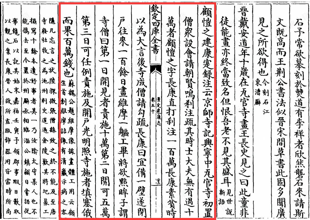 晋哀帝兴宁二年(364),当时南京瓦官寺刚建成,僧众请朝中贤达“鸣刹注疏”(当时寺僧向社会募捐的一种方式),士大夫施钱没有超过十万的,唯独平日清贫的顾恺之扬言要布施百万。在大家都认为他大言不惭时,他让寺里僧众准备一面墙壁,闭门一个多月,画了一尊佛教人物维摩诘的画像。快画完将要点眼睛时,他对寺僧说:“工毕将欲点眸子”,并说“第一天观看的人需布施十万,第二天观看的人需布施五万,第三天可任意布施”。等到开门时,果然前来布施的人很多,很快就募集到了百万。《景定建康志》记载的这则故事既肯定了顾恺之绘画技艺的高超,也生动反映了当时佛教美术的兴盛。