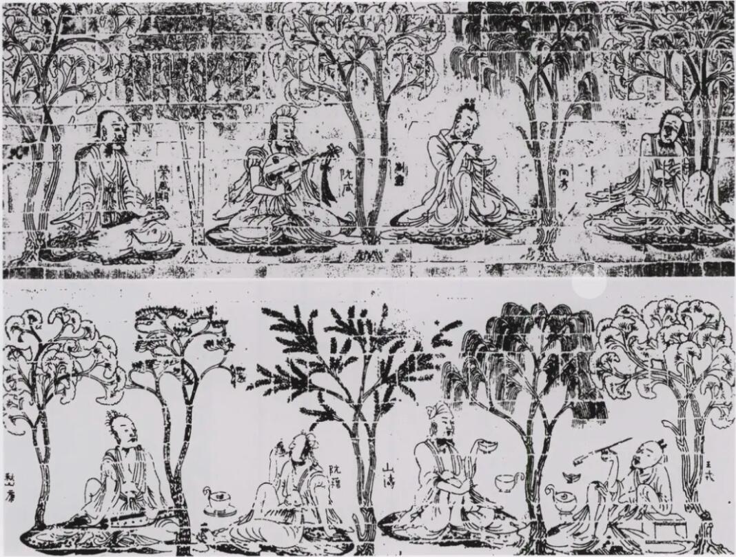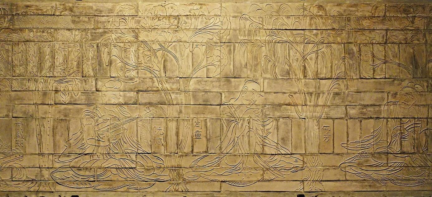 出土于南京西善桥宫山北麓的“竹林七贤与荣启期”砖画是美术史上非常重要的作品,其风格虽是模印砖画,但改变了汉画像砖剪影式的风格。运笔上吸收了印度佛教画中线条流畅、柔软但又柔中见刚的特点,整体“长线缭绕,秀骨清朗”;而散点透视的方法,则继承了古代绘画的传统。整个砖画注重“写神”,人物清瘦秀丽,颇具“陆(探微)得其骨,顾(恺之)得其神”的画风,恰如其分地把当时士人独特的性格,空虚、颓废的精神面貌生动地刻画了出来,体现了南北朝时期的绘画艺术特点。