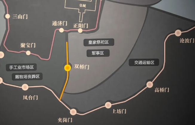 从夹岗门沿外郭往西不远,外郭城向北伸出一道通向京城城墙的土垣。因其与环形的外郭城之间形成“丁”字形,所以这段向北伸出的城墙被称为“丁字墙”;又因是夯土而成,故而也称“土城头”。在这段丁字墙上开有一座城门,因附近有双桥而得名“双桥门”。