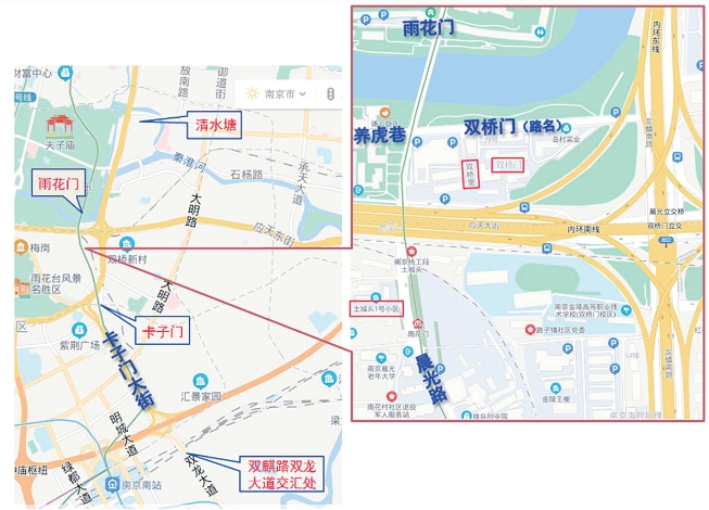土城头路在离雨花门不远、内环南线高架下面的地方,有一个与宁芜铁路交叉的路口,平时宁芜线上有火车通过,行人、自行车和各种车辆都得在火车鸣笛声中等待。过了宁芜线,就到了丁字墙上的城门双桥门附近。按《南京明外郭》所述,双桥门原址应该位于如今的双桥里小区内。也就是说,丁字墙从外郭往北到双桥门附近开始靠近明京城城墙,到民国时增辟的雨花门附近时,两者走势趋于一致,并隔秦淮河相望。