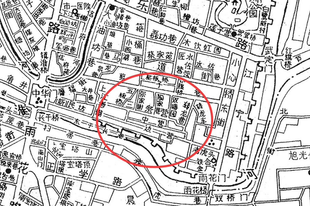 中营位于边营与三条营之间,东起老虎头,西至新拓宽的箍桶巷路,长度约200米。从清代到民国,此地有三多:一是织机房(织云锦)多,二是会唱“白局”的多,三是扎花灯(秦淮灯彩)的多。如今,南京云锦、秦淮灯彩、南京白局都已被列入国家级非物质文化遗产名录。