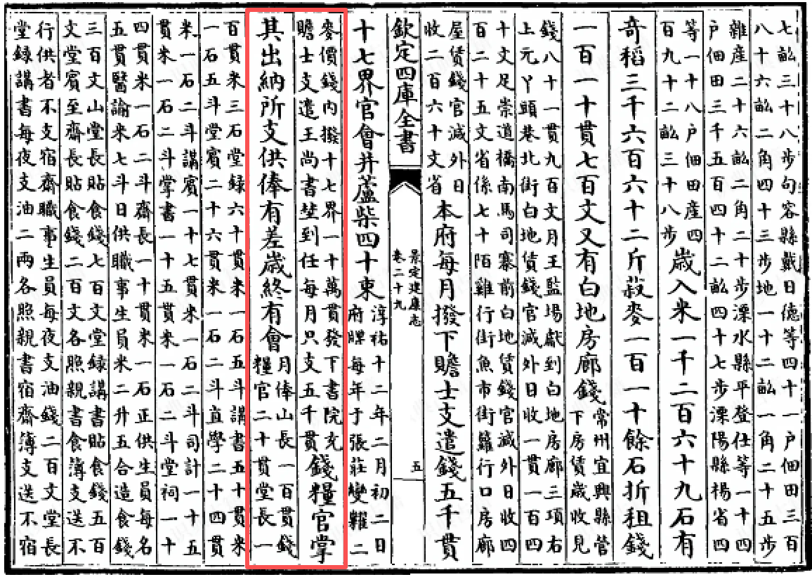 钱粮官主管书院田产钱粮,宋《景定建康志·明道书院》:“钱粮官掌其出纳,所支供奉有差,岁终有会。”钱粮官下设“司计”一职为其助手。