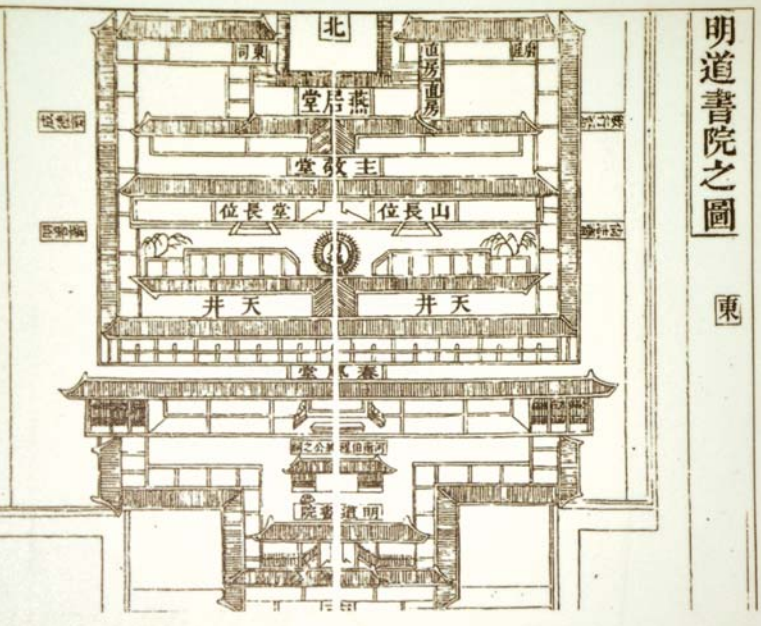 明道书院是宋代府级书院中全国知名的书院,是南京历史上规模最大、南京城内设立最早的书院。它设有程颢祠、御书阁、春风堂、主敬堂、燕居堂,尚志、明善、敏行、成德、省身、养心六斋,钱库、直房、后土祠、大门、中门等建筑。设置了山长、堂长、堂录、讲书、堂宾、直学、讲宾、钱粮官、司计、掌书、掌祠、斋长、医谕等职位。这是南京比较有代表性的一个书院组织机构,共十三种职位,分别设有专门的办公场所。