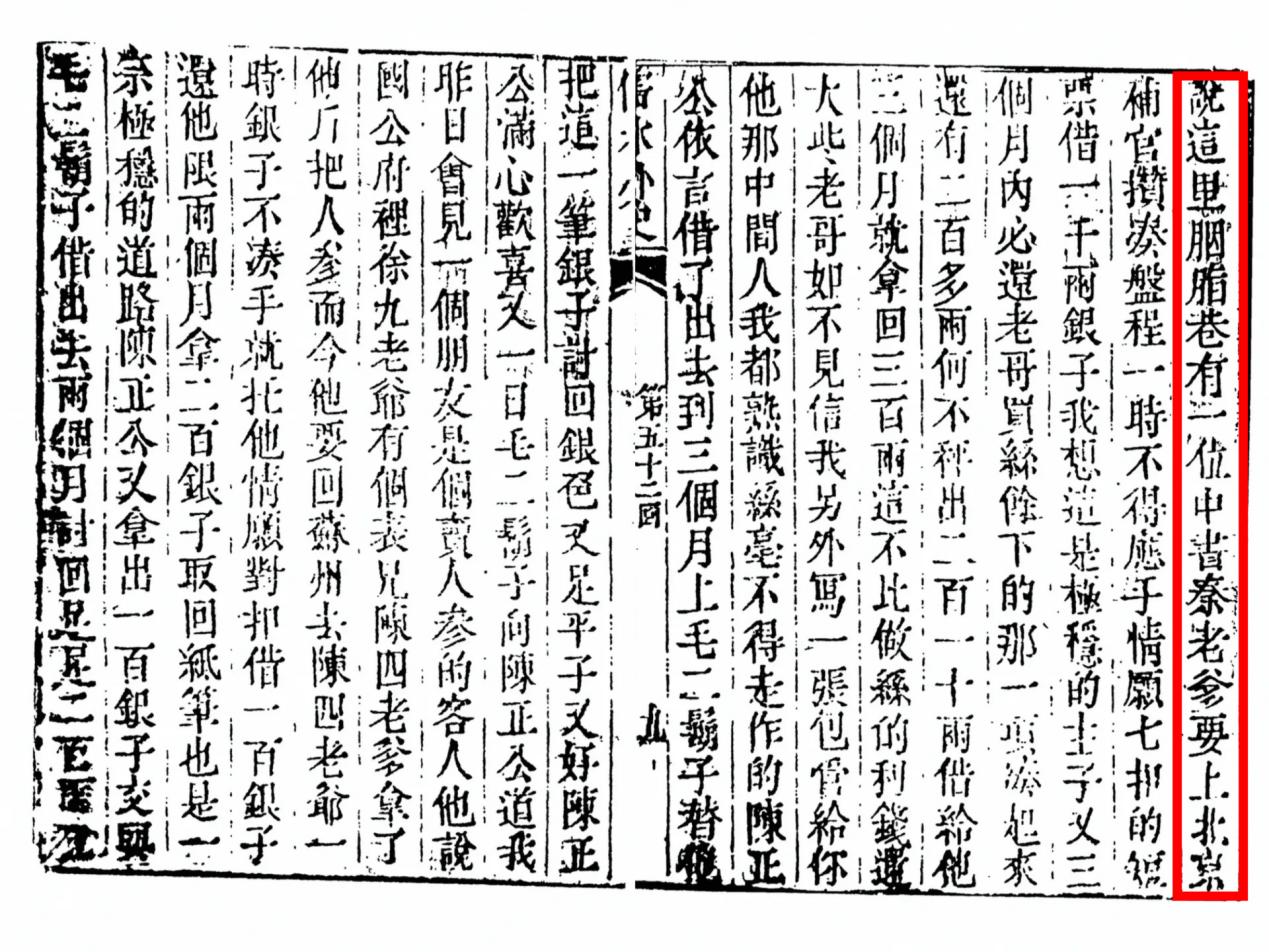 书中第五十二回,毛二胡子向陈正公道:“我昨日听得一个朋友说,这里胭脂巷有一位中书秦老爷要上北京补官,攒凑盘程,一时不得应手,情愿七扣的短票,借一千两银子。”