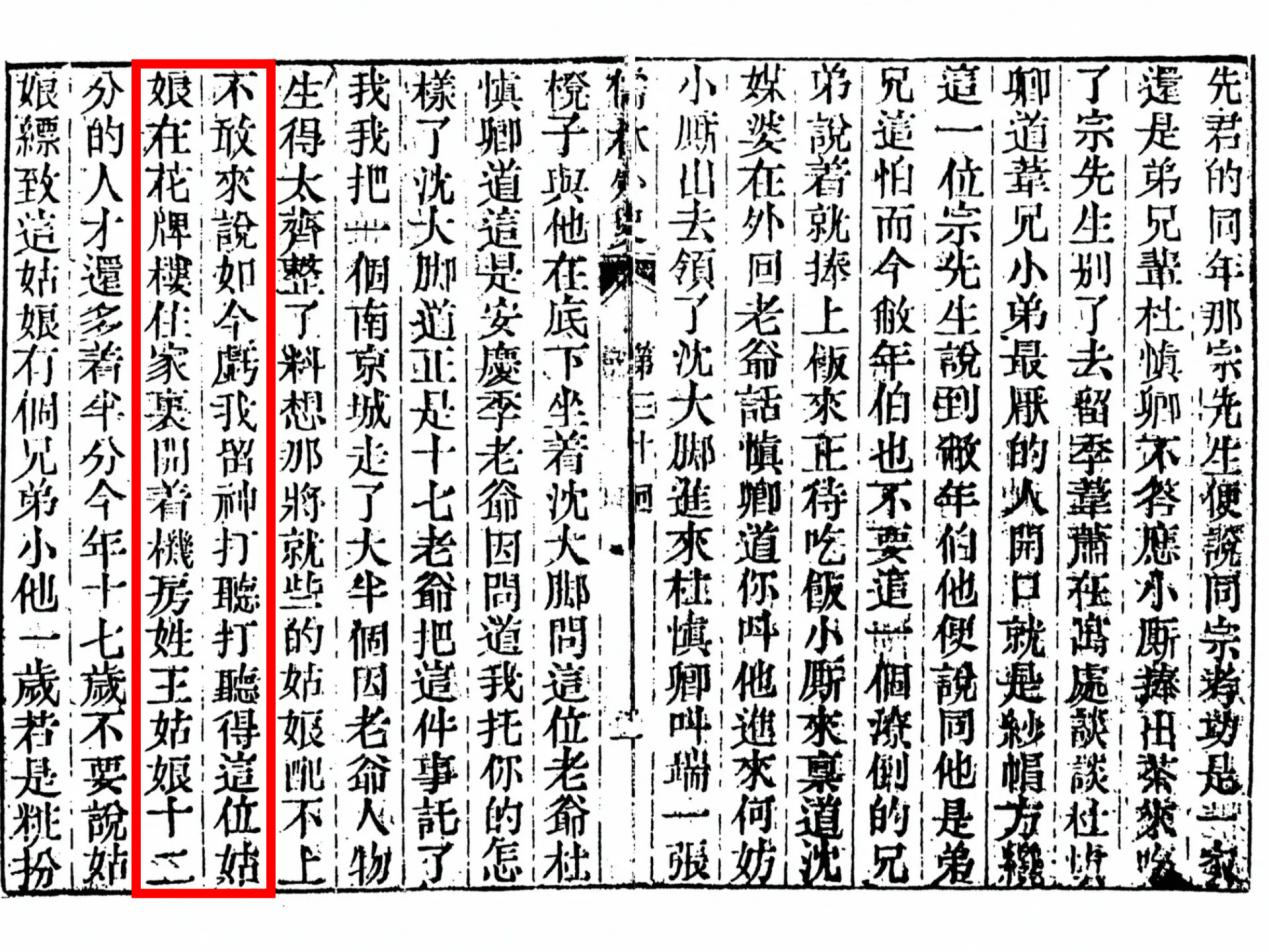 书中第三十回,沈大脚道:“如今亏我留神打听,打听得这位姑娘在花牌楼住,家里开着机房,姓王。姑娘十二分的人才还多着半分。今年十七岁。”