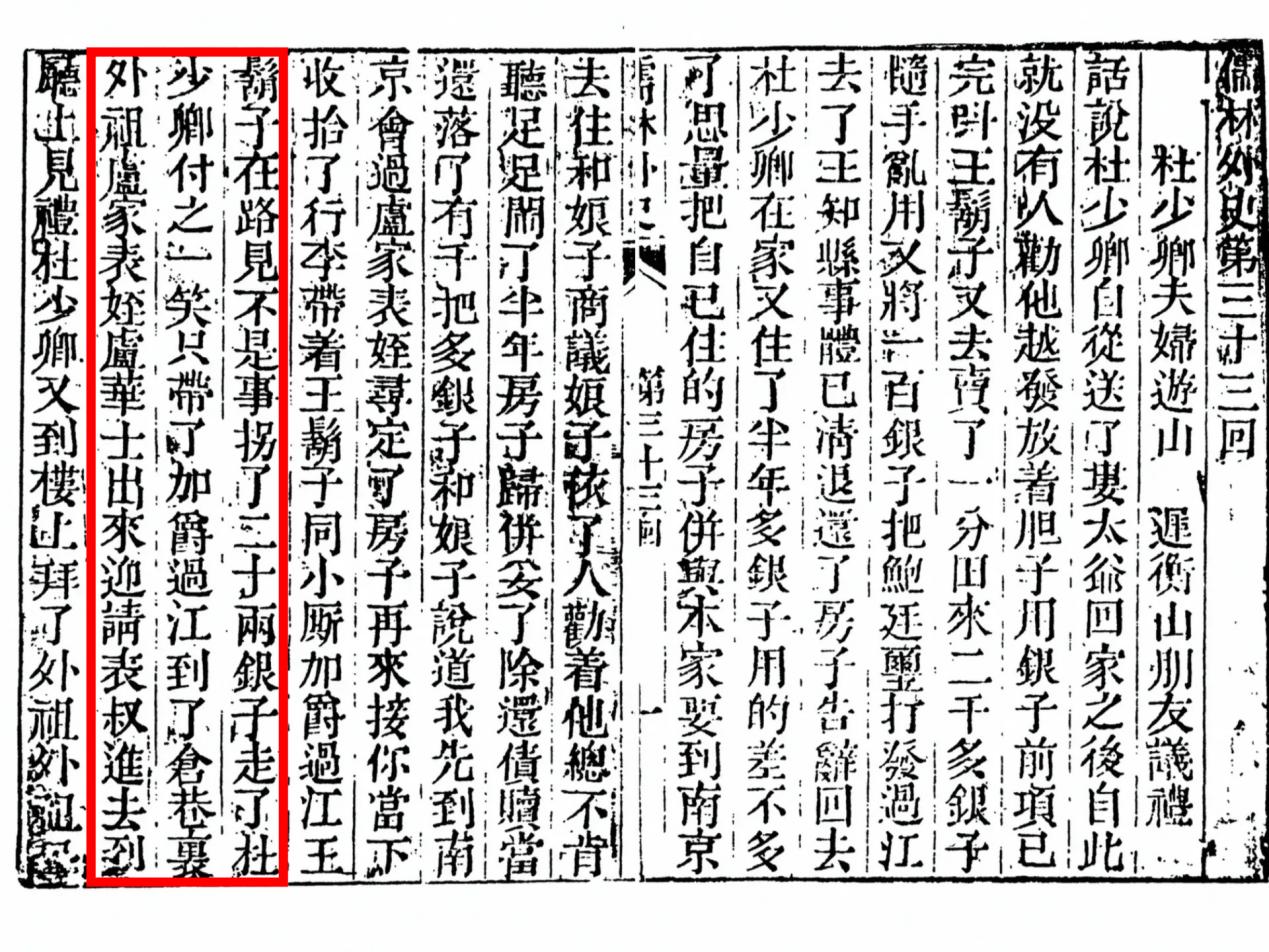 书中第三十三回写道:“到了仓巷里外祖卢家,表侄卢华士出来迎请表叔进去,到厅上见礼。杜少卿又到楼上拜了外祖、外祖母的神主。”“杜少卿便到仓巷卢家去会迟衡山。卢家留着吃饭。”
