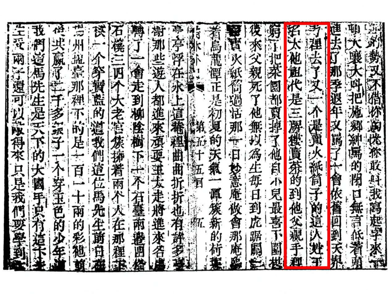 书中第五十五回写道:“一个是卖火纸筒子的。这人姓王,名太,他祖代是三牌楼卖菜的,到他父亲手里穷了,把菜园都卖掉了。他自小儿最喜下围棋,后来父亲死了,他无以为生,每日到虎踞关一带卖火纸筒过活。”