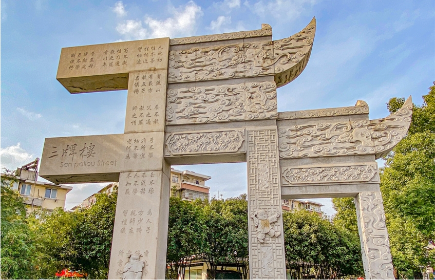 三牌楼在鼓楼西北,与娄子巷相连。相传有一家三兄弟相继中了功名,为了纪念母亲的恩德,在今三牌楼十字路口北面,坐北朝南,每人建造了一座牌楼,因此得名。