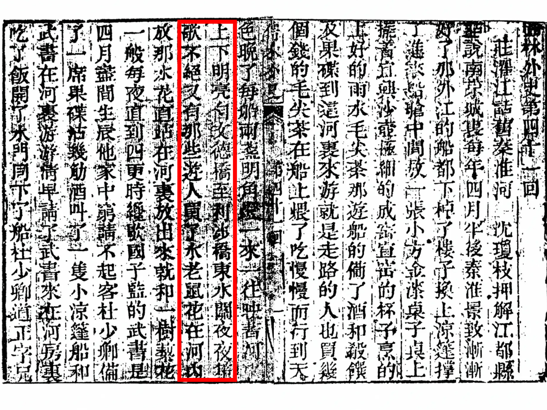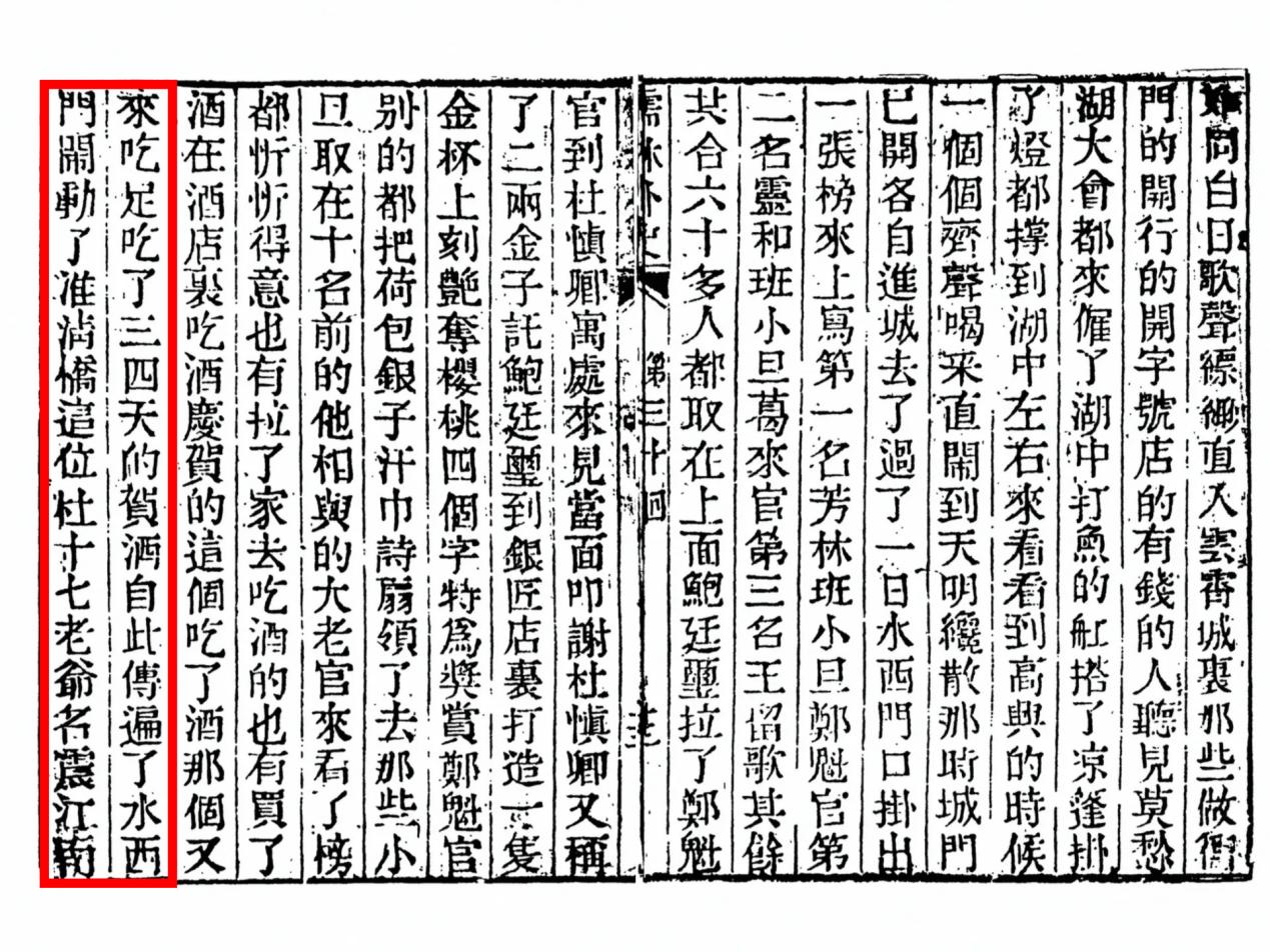书中第三十回写道:“今年十七岁,不要说姑娘标致,这姑娘有个兄弟,小他一岁。若是妆扮起来,淮清桥有十班的小旦,也没有一个赛得过。”“这个吃了酒,那个又来吃,足吃了三四天的贺酒。自此传遍了水西门,闹动了淮清桥。”