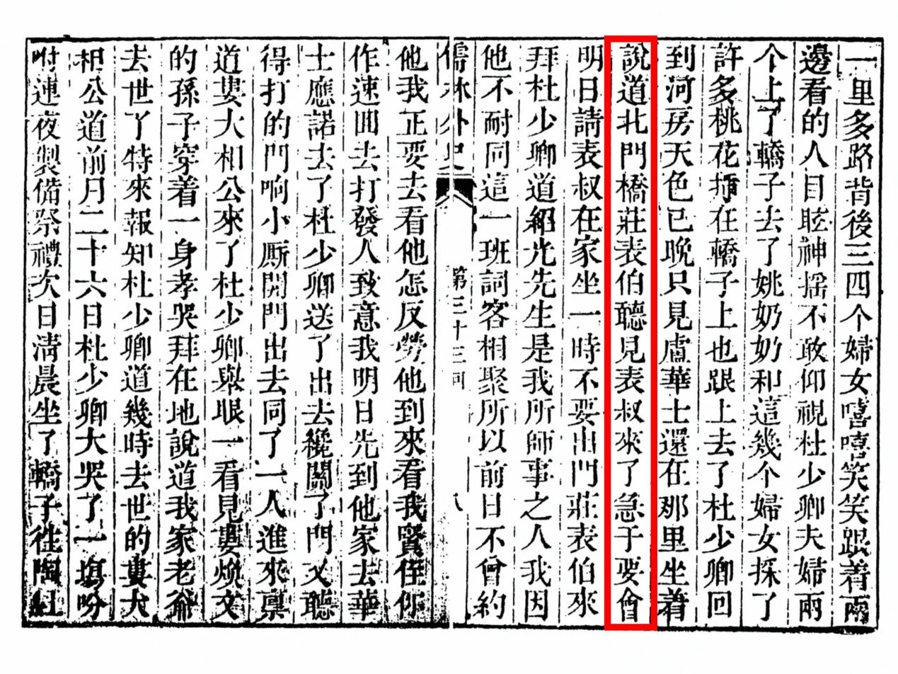 书中第二十六回有言:“因他有几分颜色,从十七岁上就卖与北门桥来家做小。”第三十三回提到:“北门桥庄表伯听见表叔来了,急于要会;次日,便到北门桥去拜庄绍光先生。”