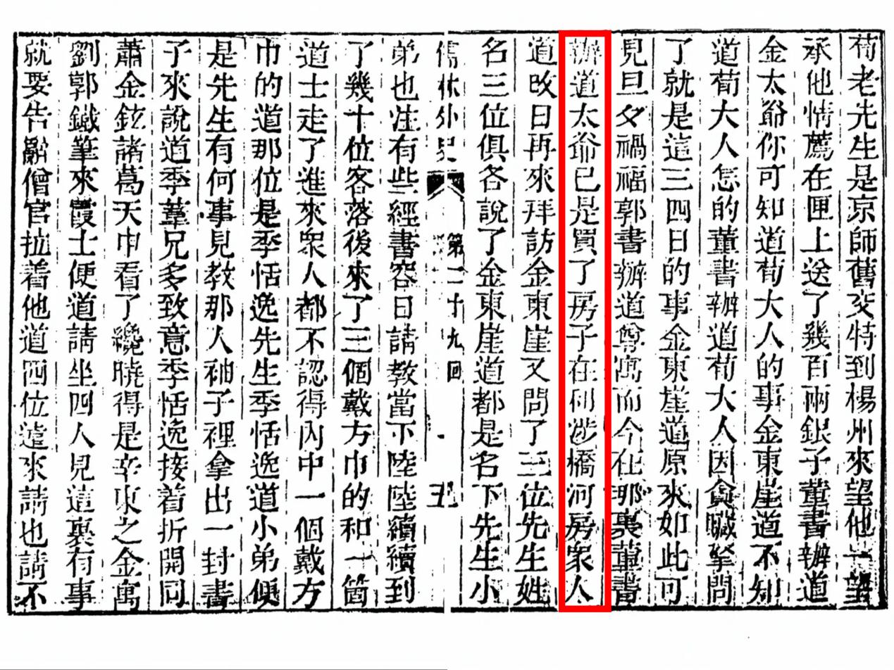 书中第二十九回写道:太爷已买了房子,在利涉桥河房。第三十六回又言,现住在利涉桥河房里。第三十七回还提到,武书辞了出来,才走到利涉桥,遇见一个人。