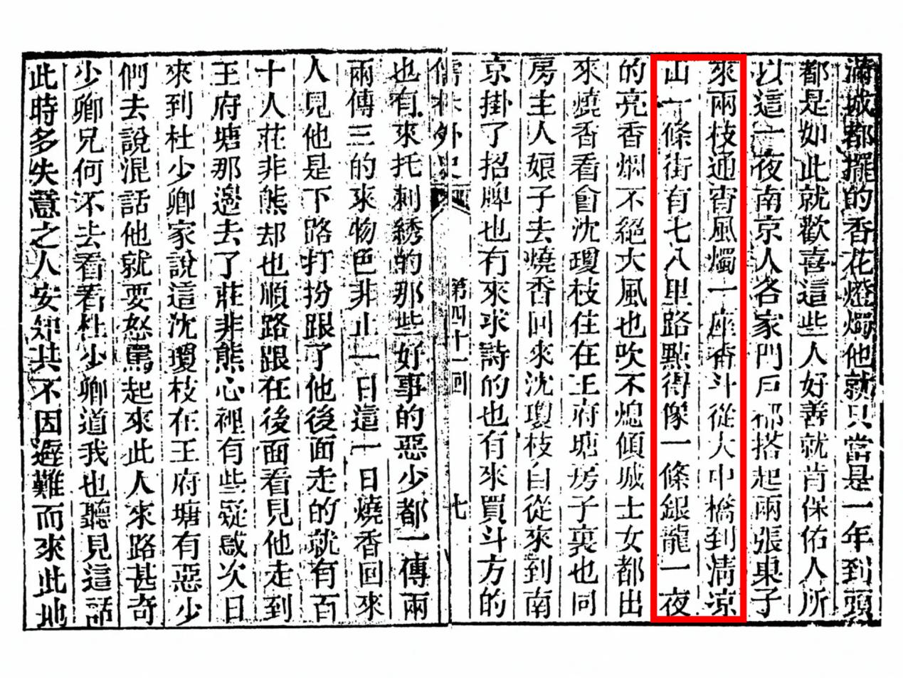 书中第四十一回写道:从大中桥到清凉山,一条街有七八里路。