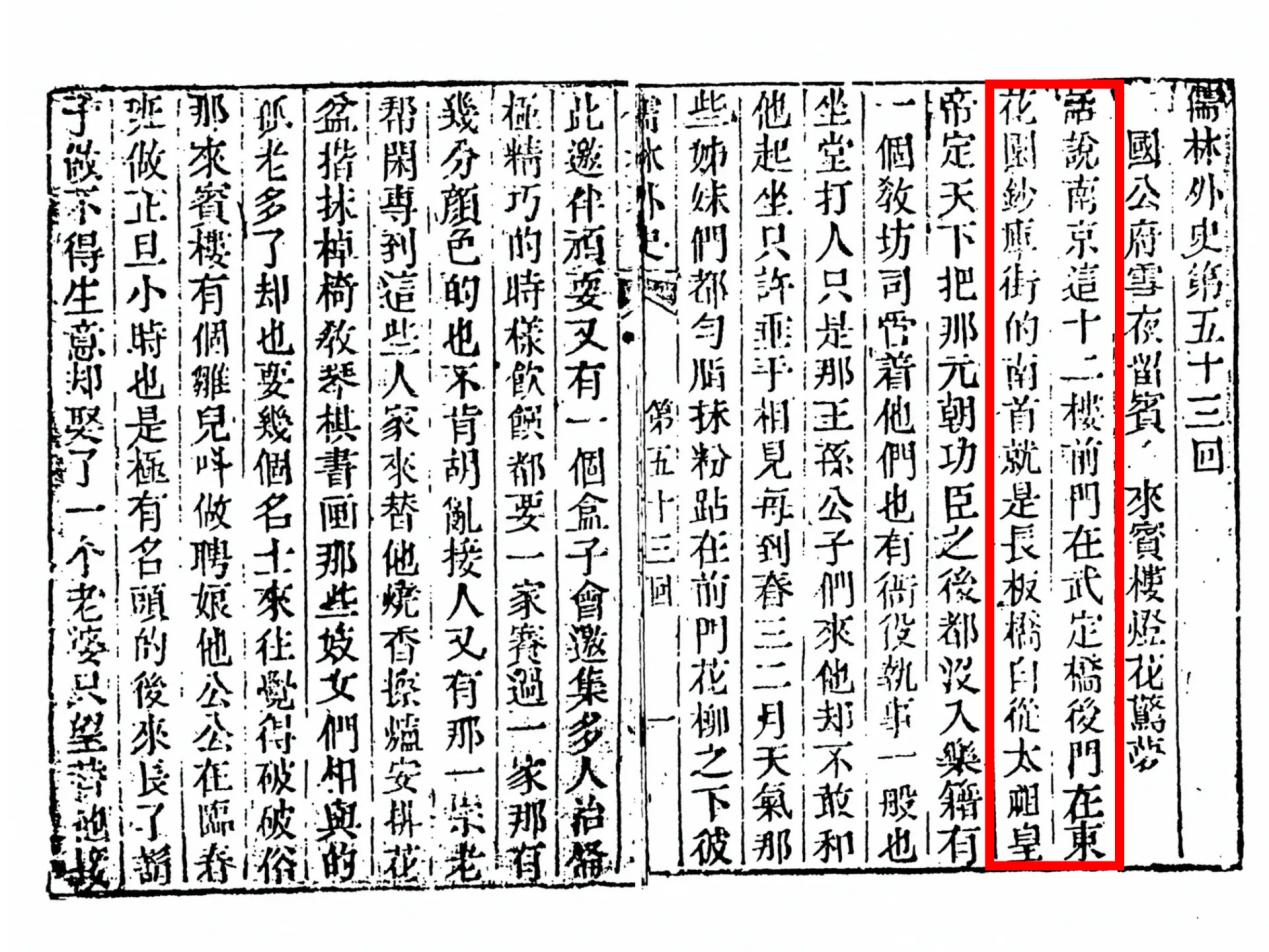书中第五十三回提及:“话说南京这十二楼,前门在武定桥,后门在东花园。钞库街的南首,就是长板桥。”