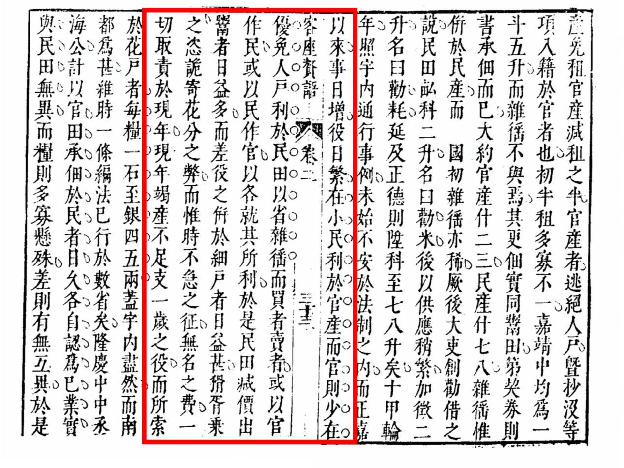 《条编始末》中写道:“正、嘉以来,事日增,役日繁。在小民,利于官产,而官则少;在优免人户,利于民田,以省杂徭。而买者卖者,或以官作民,或以民作官,以各就其所利。于是民田减价出鬻者日益多,而差役之并于细户者日益甚。”可见当时赋役制度之混乱,小民负担之沉重。和明初相比“不啻膏壤矣”。《坊厢始末》中记载了居住坊厢间的市民及手工业户,在官府的压榨下,无法应付贪官污吏的百般勒索,担负繁重徭役,弄得“倾败相继,自经自溺者日闻,而民不堪命也”。在《荒白》中,作者更是愤怒地揭露当时税赋制度的不合理,连已经荒芜和滨江圩塌的田地,还要分摊到其他田地上来征税,诘问道:“古者任土作赋,履亩而税,《春秋》讥之。今既已荒矣,征之何名?”