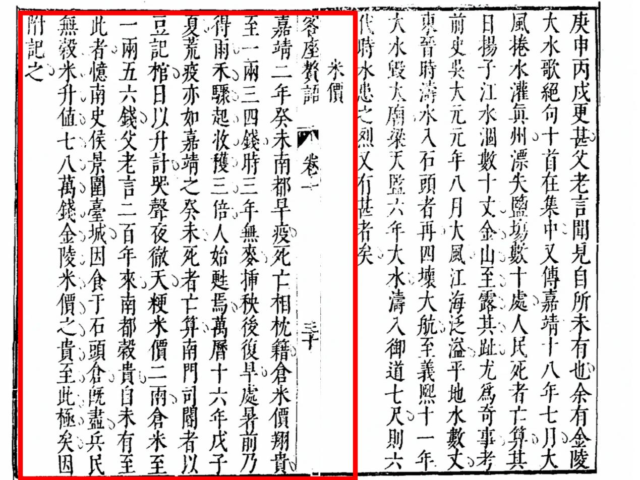 顾起元关心民间疾苦,如实记载自然灾害,并提出了解决办法。他在《水灾》中记述道:“万历十四年丙戌五月初三日大雨,至十七日城中水高数尺,儒学前石栏皆没,江东门至三山门亦行舟。”在《米价》中记载:“万历十六年戊子夏,荒疫亦如嘉靖之癸未,死者亡算,南门司阍者以豆记棺,日以升记。哭声夜彻天。粳米价:二两仓米至一两五六钱。”作者在《议籴》中认为南京未荒灾时米价昂贵,是因为“惟仓廪不发,而湖广、江西亦荒,米客不时至,则谷价骤踊,而人情嗷嗷也”。建议将“仓粮酌量放一二月,则城中顿有十余万米流布地上,米价自平,哺者必众。”
