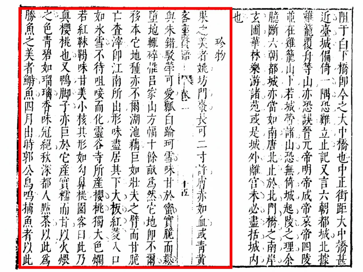 书中还生动记载了南京的风物土产与市井生活。《市井》中记载了南京当时的市场分布情况及兴衰过程。在《铺行》里揭露了官府对商人的敲诈勒索,从而导致商业的凋零。在《珍物》里描述当时南京的风物土产,有“味甘于蜜”的姚坊门枣;有“入口如冰雪,不待咀唼而化”的大板红菱;有灵谷寺的樱桃、玄武湖的鲫鱼;有著名的板桥萝卜、善桥葱。在《方言》《诠俗》等则中记录了南都的方言土语。在《巾履》《服饰》等则中描述了明朝南京服饰打扮的样式及变化,在其他章节里还记述了友人轶事、外事交往、南京藏画及壁画、花木盆景等等。