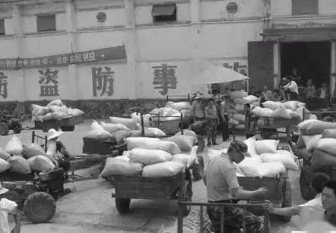 这些工人干的是体力活,他们拉车扛包,经常汗流浃背、疲惫不堪。在我印象中,仙鹤街粮站送粮队中有一位中年女工,脸上红扑扑的,长得很壮实。她除了背绳拉车外,还负责松开粮袋上的麻线,助力运输工将麻袋扛上肩,然后清扫运输车,始终忙个不停。他们的午餐非常简单,几块烧饼加上粮站提供的白开水就解决了吃饭问题。他们的收入也不高,由车队单位发放,与粮站没有直接的经济利益关系,但相互之间配合得很好。