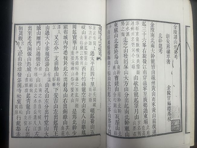 此书内容主要分“北干龙考”“南干龙考”,即南北两大山脉。金陵两大山脉以秦淮河为界,形成虎踞龙盘之势。北干称省龙,南干称府龙,其中“北干为要”,城内学宫、贡院及衙署都在此山脉上。书中对于钟山至冶城一段着墨颇多,“鉴往辙示来兹,用意尤深且远焉 ”。书中记载,朝天宫所在的冶山,为“省干尽结余气之所在”,也就是龙脉上龙尾的节点。此外,对金陵风水有简略介绍,如由于“明初建都填前湖而后湖独存”,以至金陵“称为乐土”,“人文财富甲乎东南”。