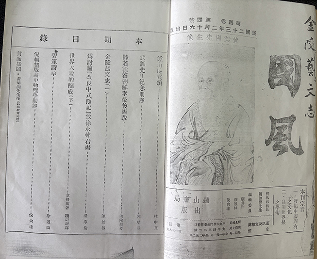 该期目录有钟山地质颂、武训先生纪念册序、陆若汗答朝鲜李荣后书跋、金陵艺文志(一)、为讨论《改良中式簿记》致徐永祚君书、世界大战的酿成、碧笙书草、倪编出版高中物理学勘误、封面插图·黄梨洲先生像(鄞县教育局赠)。