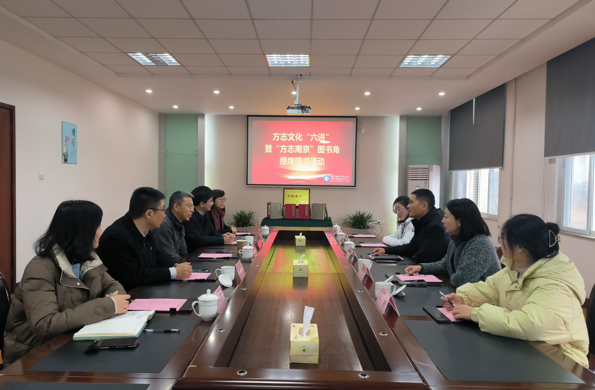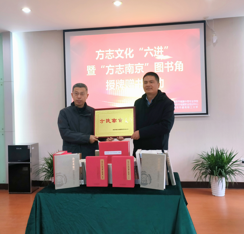 1月17日上午,南京市地方志办公室党组成员、副主任郑国军率方志文化传播处、机关党委等相关负责同志到南京市城建中等专业学校,开展方志文化“六进”暨“方志南京”图书角授牌赠书活动。南京市城乡建设委员会副主任、二级巡视员陆一,南京市城建中等专业学校校长陈学武、书记刘华、副校长戴芳华等参加此次活动。
