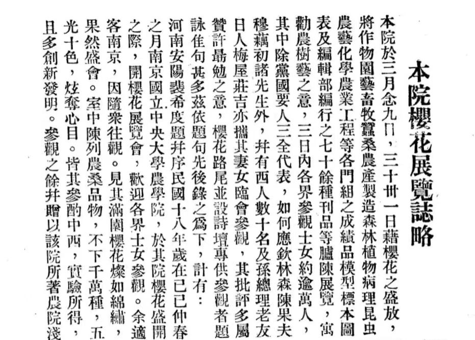 根据《国立中央大学农学院旬刊》,这次樱花展览会,是由农学院院长王善佺发起,由李乃尧、张天才、罗清生、李驹、李寅恭等五位教授具体筹办,目的是:“藉游春赏景之期,寓劝农树艺之意。”也就是樱花搭台、农艺唱戏,意在展示并推广农学院的工作成果。从上述裴希度先生的参观感受看,也的确达到了这个目的。