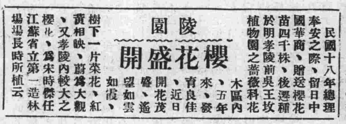春天一到,樱花就频繁出现在南京报纸的版面上。3月初,报纸开始预报樱花开放的日期。之后,开始报道游客赏花的盛况。如1937年4月8日,明孝陵樱花开放,游人如织。有记者前去采访,他看到:“吴王坟上双瓣樱花甚多;明孝陵那围墙里的几十株单瓣樱花,开放得亦不错;至于风景最好之二道沟,则樱花、桃花、垂柳红绿相映,格外变成了一个美丽的画境。”吴王坟即孙权墓,二道沟在今流徽榭附近,都在明孝陵周边。
