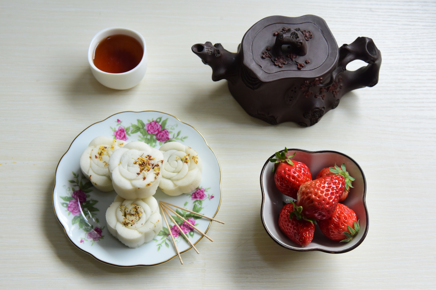 甜品茶食中有被视作“中式糖果”的酥糖、浇切片、寸金糖和花生糖,共有的特点是奇甜奇香,长江南北各地大同小异,在南京独特地被百姓称作“四色糖”,且是几乎妇孺尽知。它们是在20世纪五六十年代物资匮乏时期形成的“共同体”——每年春节前最不敢忘记领取的票证(尤其是孩子)就是“四色糖票”,各个家庭指望它甜蜜整整一个“正月节”呢。不过大部分用在招待上门的亲友和抚慰馋嘴的孩子,哪经得拿来佐茶?近年养生之道愈来愈“深入人心”,老人祈长寿,女性求瘦身,糖果、甜点视为大忌,很少人吃了。但如我这样的过来人确还存有追想,咬一丁点糖块,品一口茶,滋味无限。除上述四样之外,还有香味绵长的松子糖和微辣爽口的生姜糖,整块儿放在舌上,让茶汤滋润、化解、消融糖果,味道更不是一般香甜可尽言。
