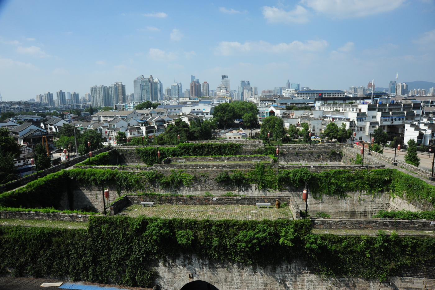 中华门布局严整、构造精巧,加之其前后内外秦淮河水作为天然屏障的独特地理优势,终成一座“一夫当关,万夫莫开”能攻易守的城堡。站在这座数百年前由无数筑城者合力造就的旷世城垣上,低头环顾,听古老斑驳的城墙回忆的历史传说;放眼远眺,看眼前川流不息的行人车辆点缀的盛世华章。我们似乎瞬间穿古越今游弋百年,又一次感受到了古城厚重深邃的历史带来的无尽感慨和遐思。