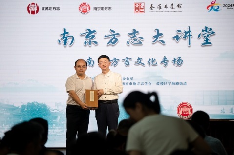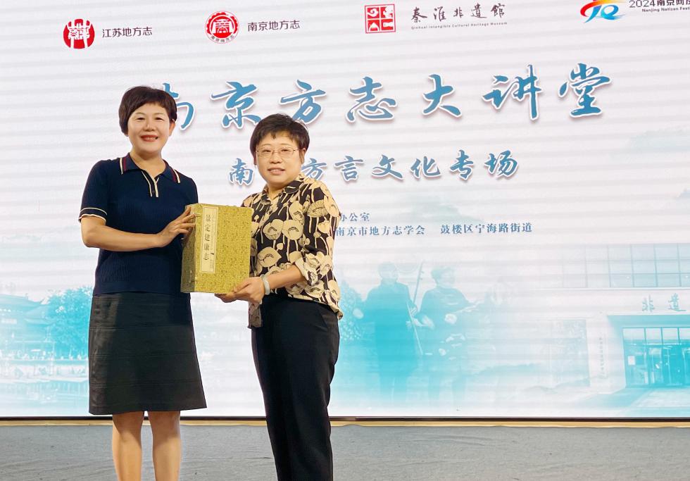开讲前,江苏省地方志办公室党组成员、副主任刘立军,南京市地方志办公室党组书记、主任姜巧玲分别向秦淮非遗馆、陈宗霞工作室所在地宁海路街道赠送了《长江历史图谱》《景定建康志》。