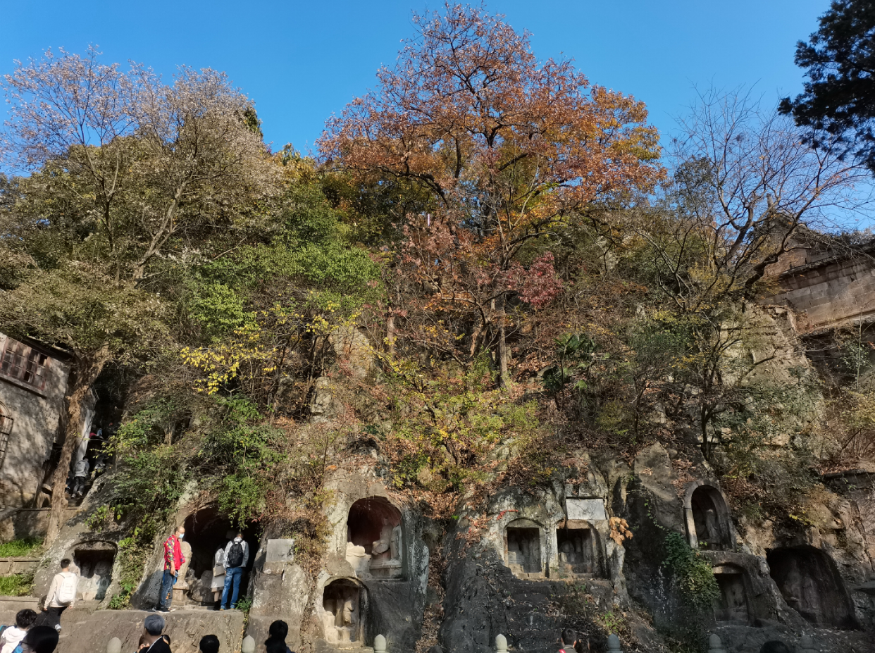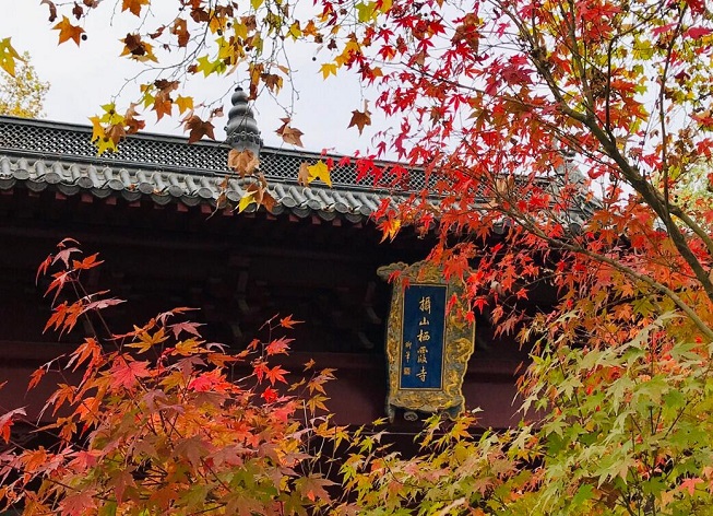 栖霞寺背倚于佛岩,远处层峦拱萃、方壑堆云,灰瓦丹墙的栖霞寺在满山经霜枫叶映衬下,显得分外肃穆壮观,气象万千。