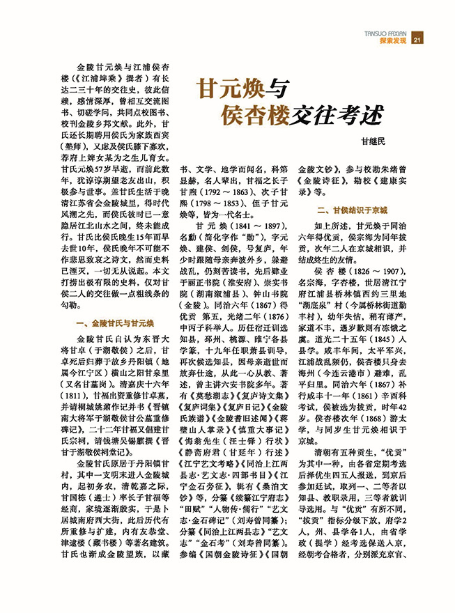 《探索发现》栏目重点刊载了甘继民的《甘元焕与侯杏楼交往考述》一文,叙述了金陵甘元焕与江浦侯杏楼二三十年的交往史。