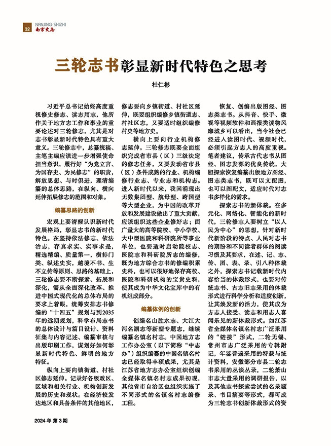 《修志园地》栏目则重点刊出了杜仁彬的《三轮志书彰显新时代特色之思考》一文,指出了三轮修志需要在编纂思路、编纂体例、编目设计、内容记述等方面进行创新,以适应新时代发展变化要求。